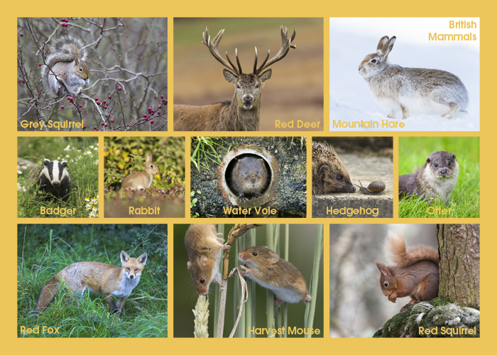 Subjects include (from top row left to right) Grey Squirrel, Red Deer, Mountain Hare, Badger, Rabbit, Water Vole, Hedgehog, Otter, Red Fox, Harvest Mouse and Red Squirrel.