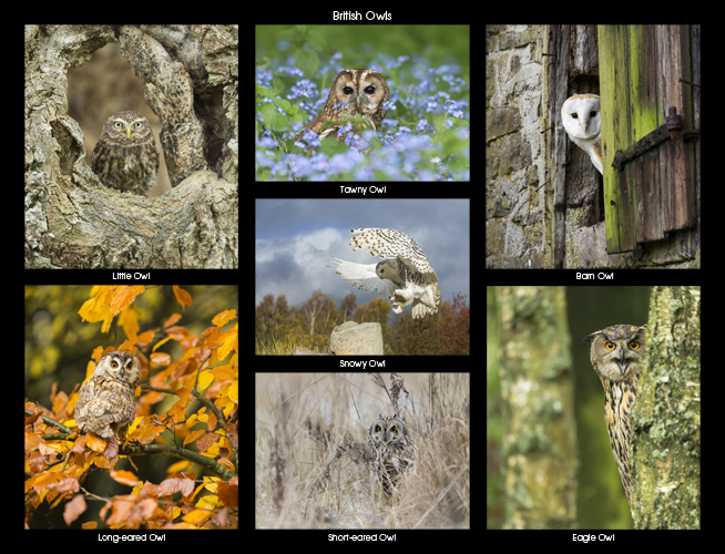 Subjects include (from top left clockwise) Little Owl, Tawny Owl, Barn Owl, Eagle Owl, Short-eared Owl, Long-eared Owl and Snowy Owl (centre).